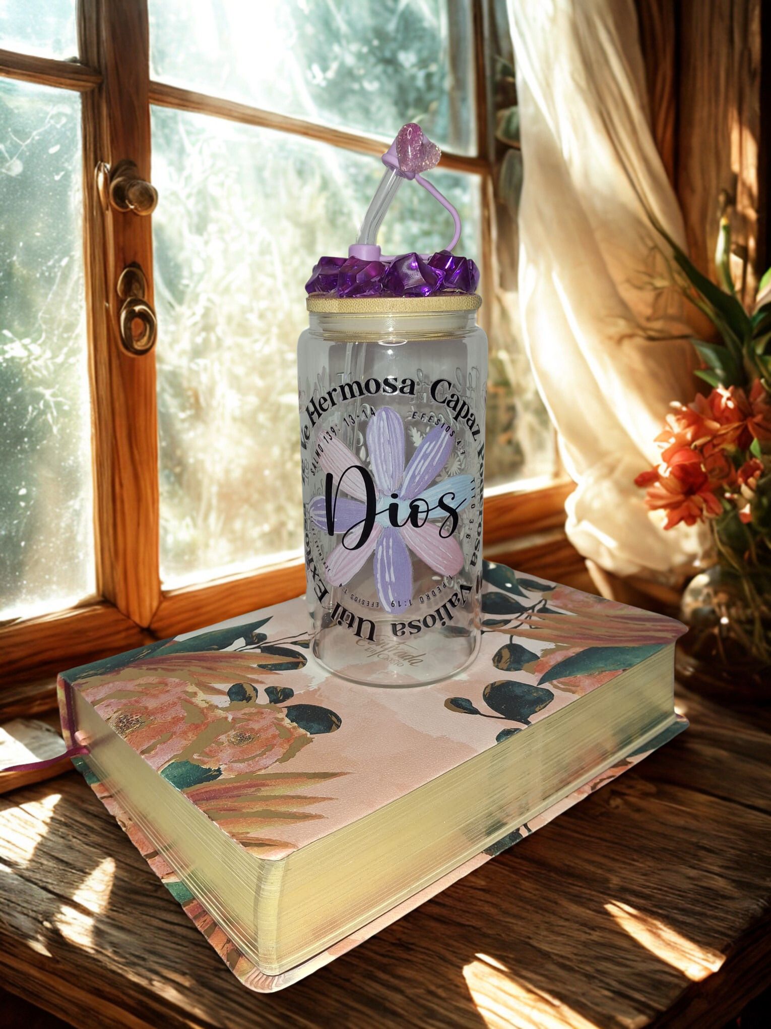 Disfruta de tus bebidas favoritas con este encantador vaso de vidrio de 16 onzas. Su diseño bíblico y la tapa decorada con hielo falso en color morado añaden un toque divertido y distintivo. Perfecto para mantenerte hidratado con estilo mientras te inspiras cada día.